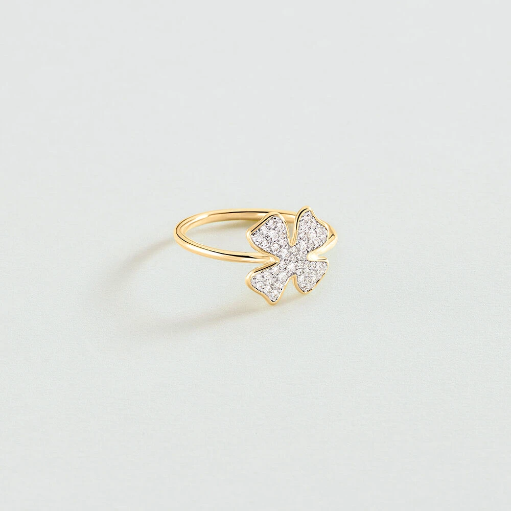 Bague en laiton doré à l’or 750/1000, rhodié et pavé d’oxydes de zirconium en forme de trèfle.