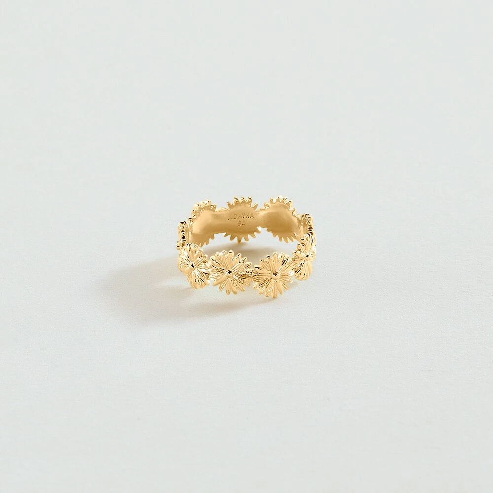 Bague tonneau en laiton doré à l’or 750/1000 faites de petites fleurs printanières.