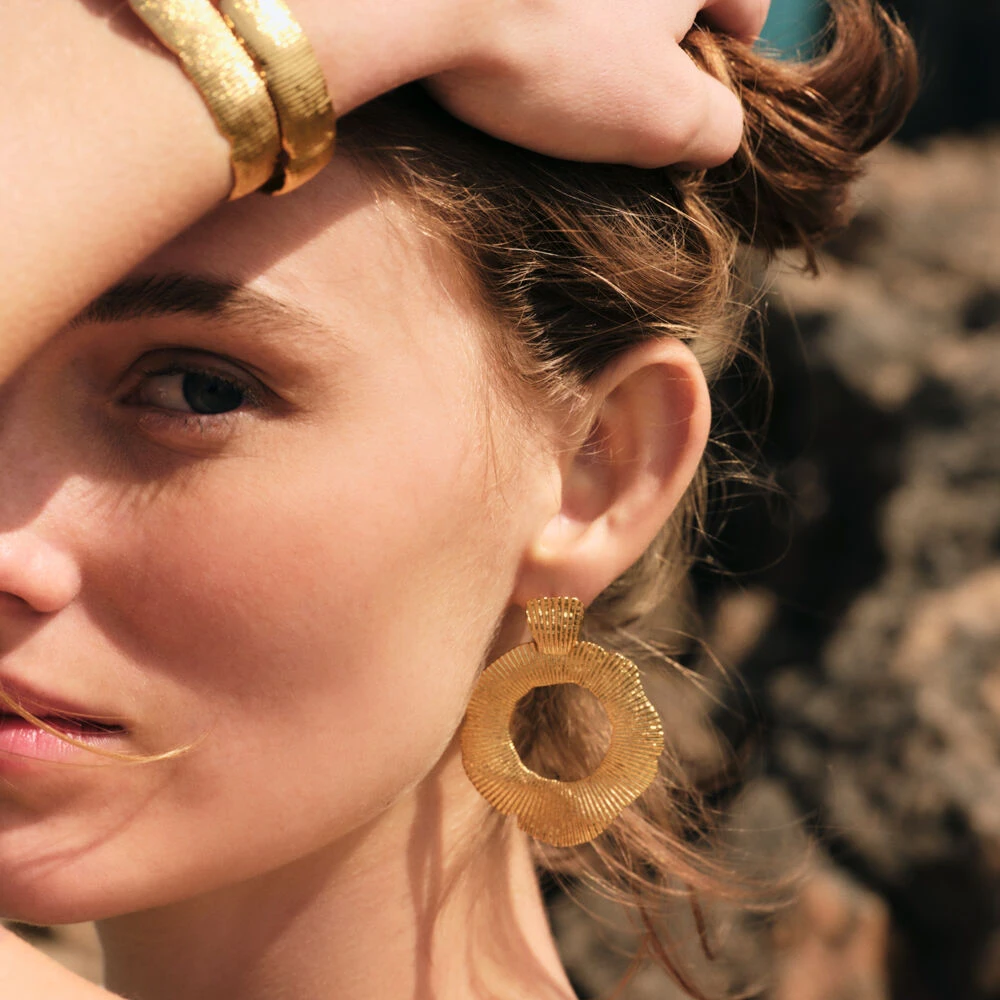 Boucles d’oreilles, en laiton doré 750/1000, anneau irregulier avec texture de coquillage .