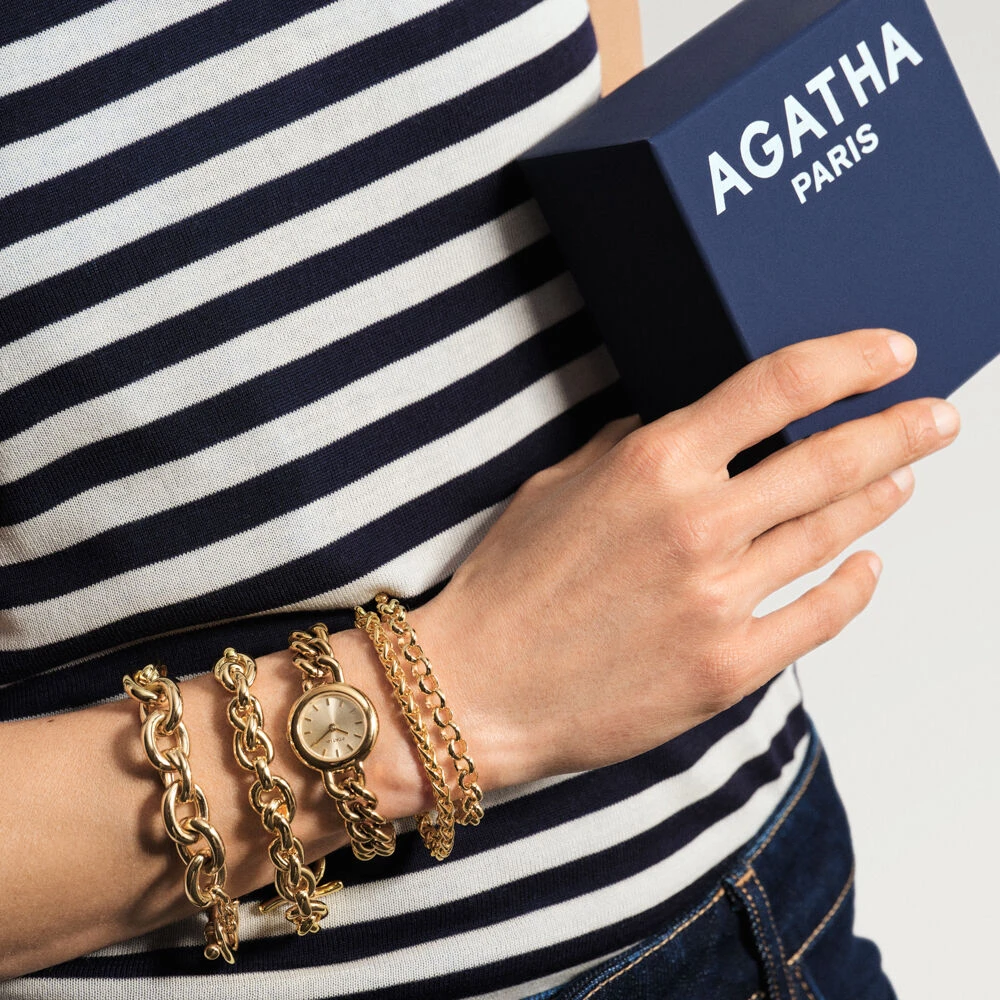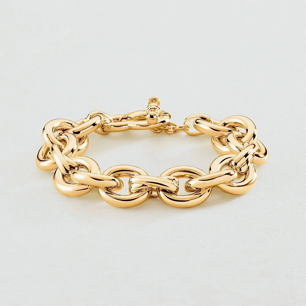 Bracelet maille en laiton doré à l’or 750/1000. Une maille avec de gros anneaux dont un en forme de X ainsi qu’un fermoir T-barre. .