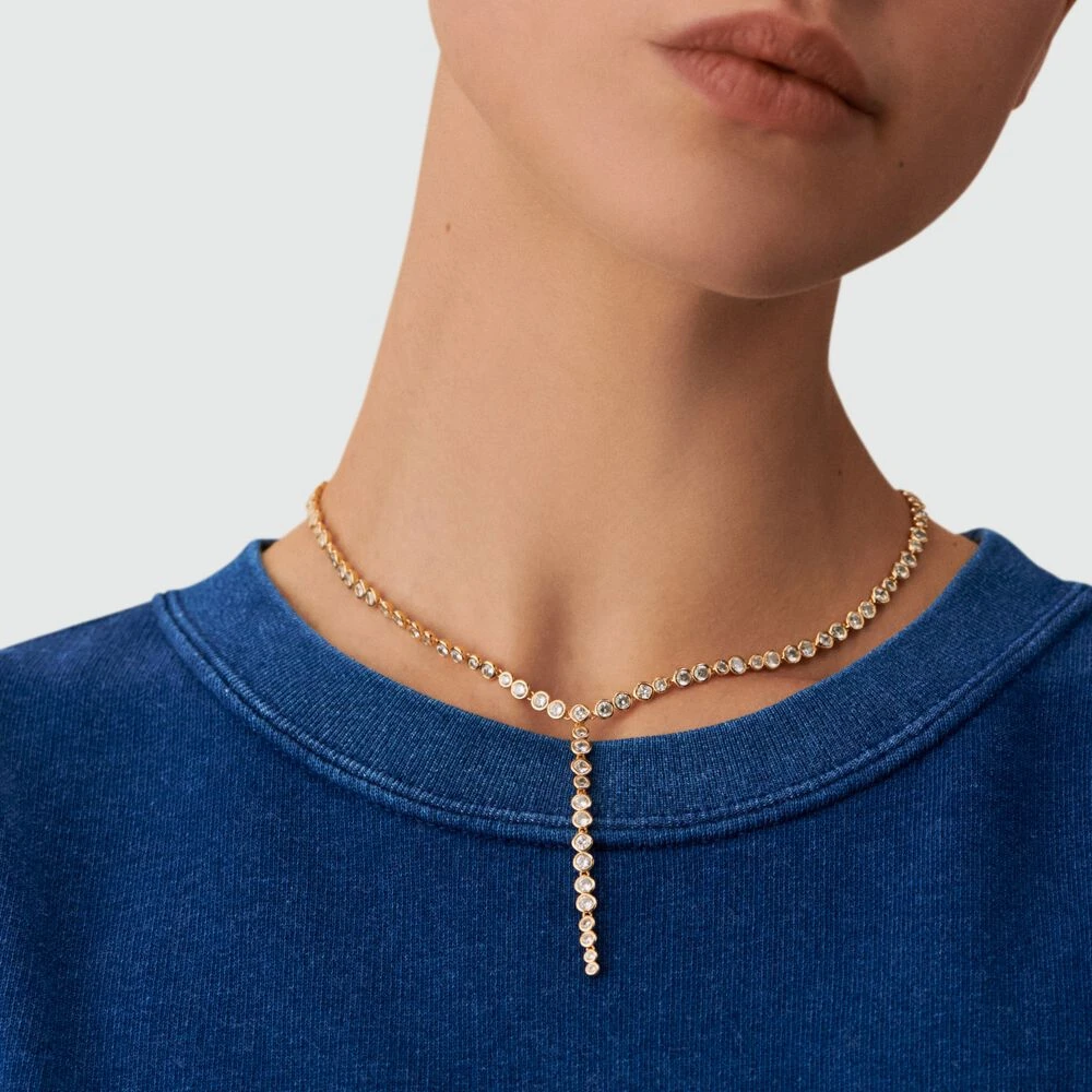 Collier Y, en laiton doré 750/1000, chaine tennis d’oxydes de zirconium sertis clos.