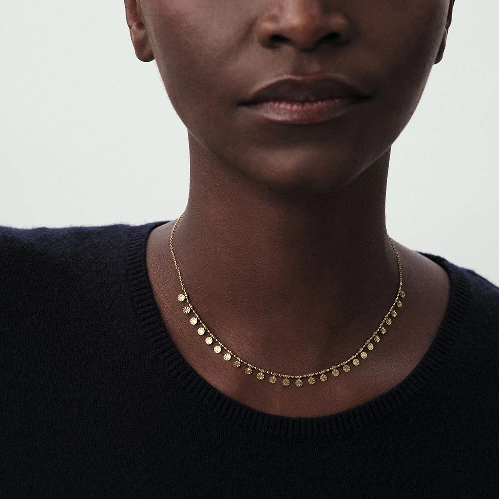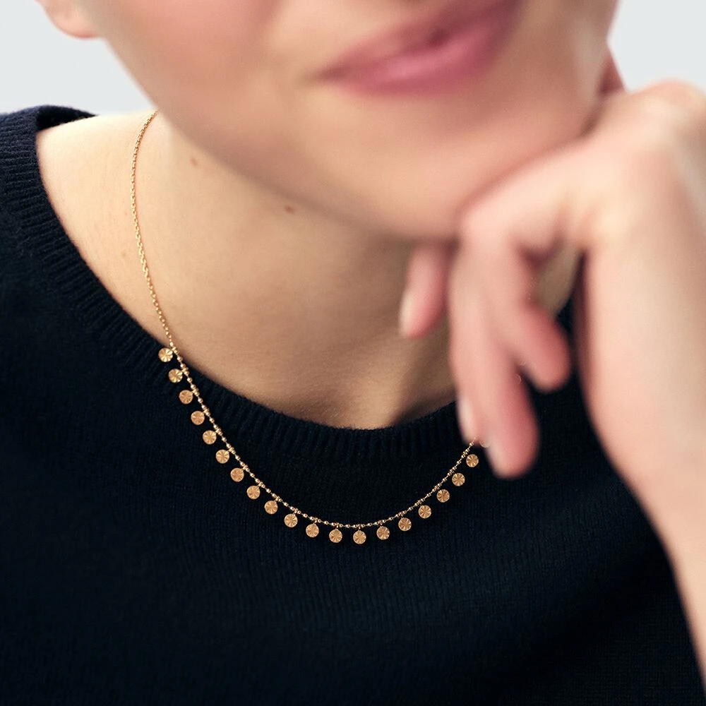 Collier court, en laiton doré 750/1000, mini médailles rondes en pampilles séparée par des petites perles de métal. Ce bijou mesure 375mm et contient une rallonge de 50mm