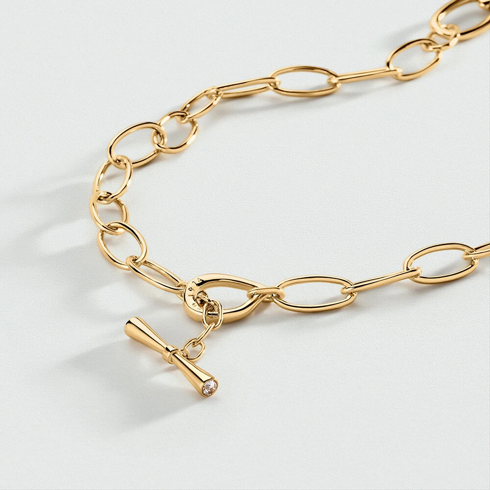 Collier chaine, en laiton doré, avec des maillons ovales allongés de différentes tailles, dégradé sur le devant, et notre fermoir T identitaire.